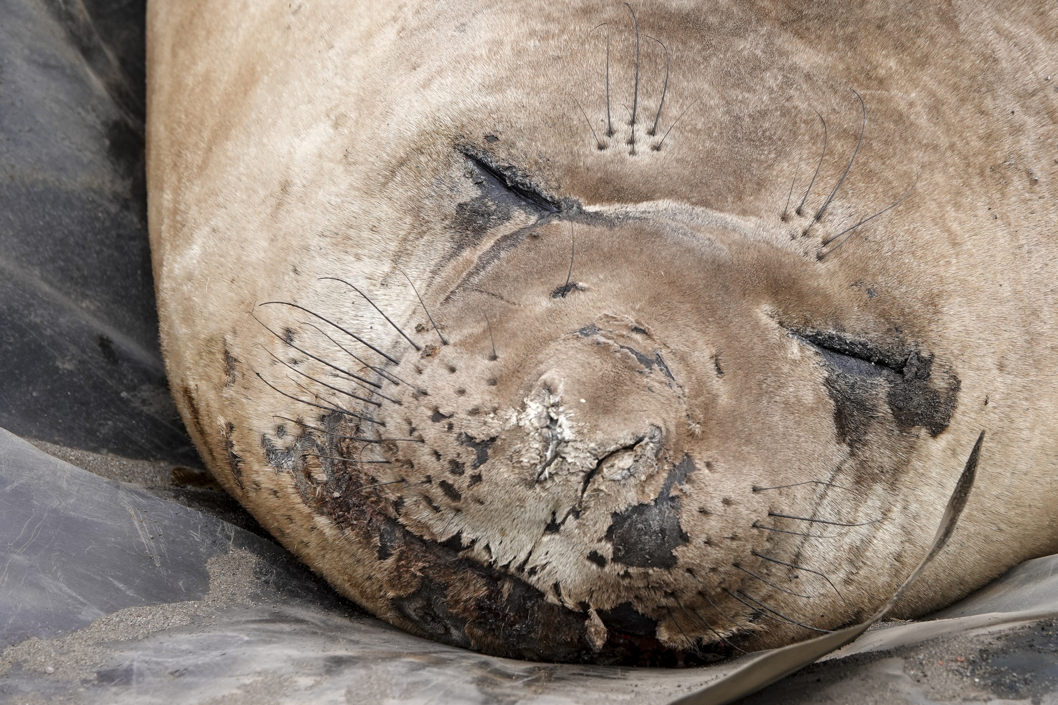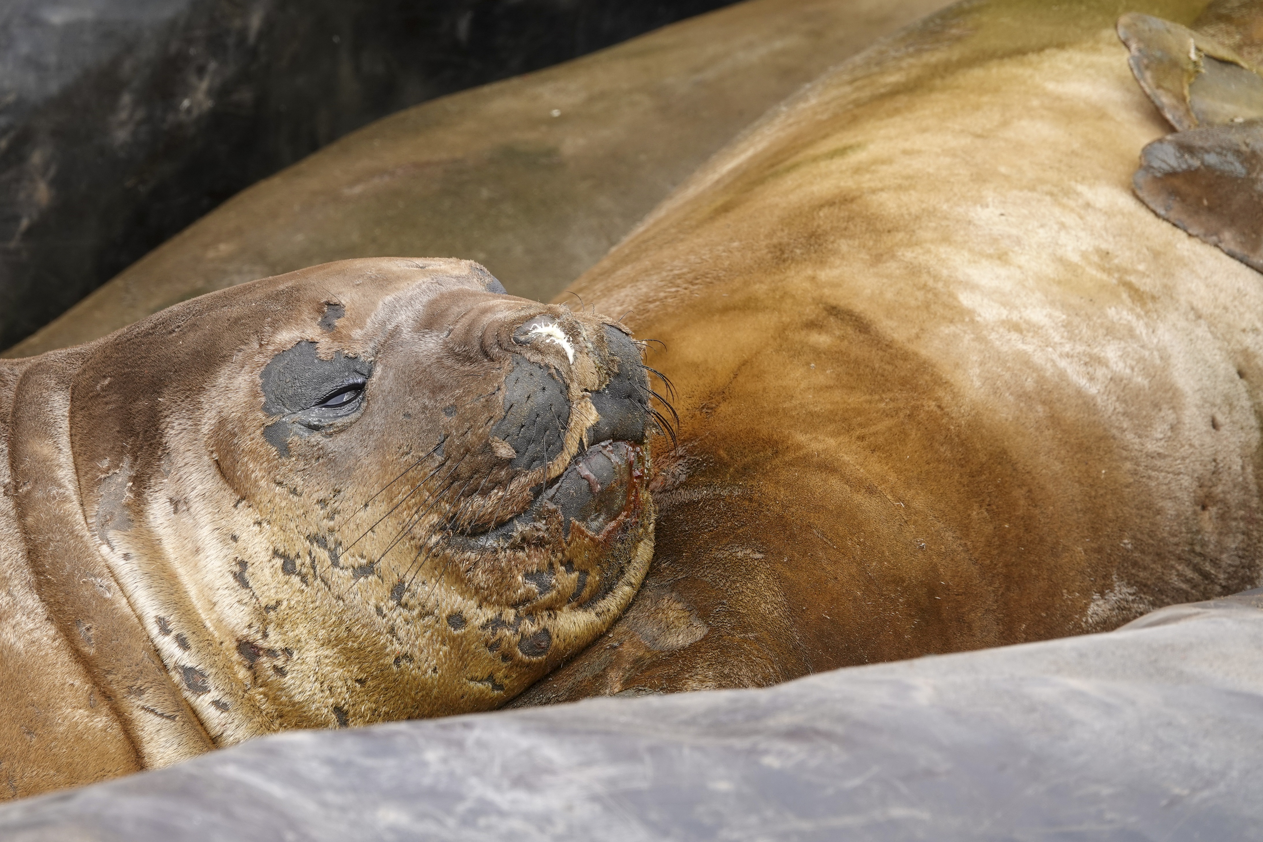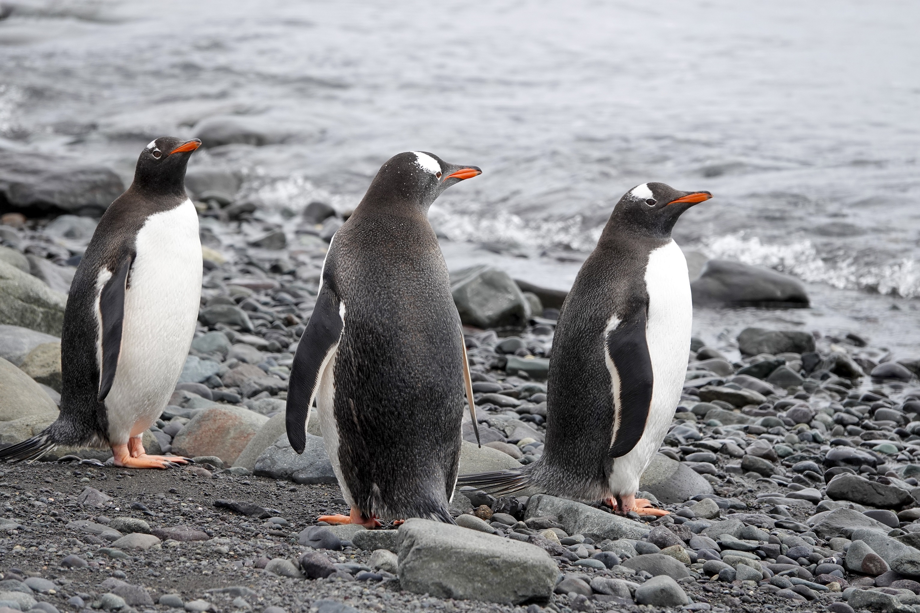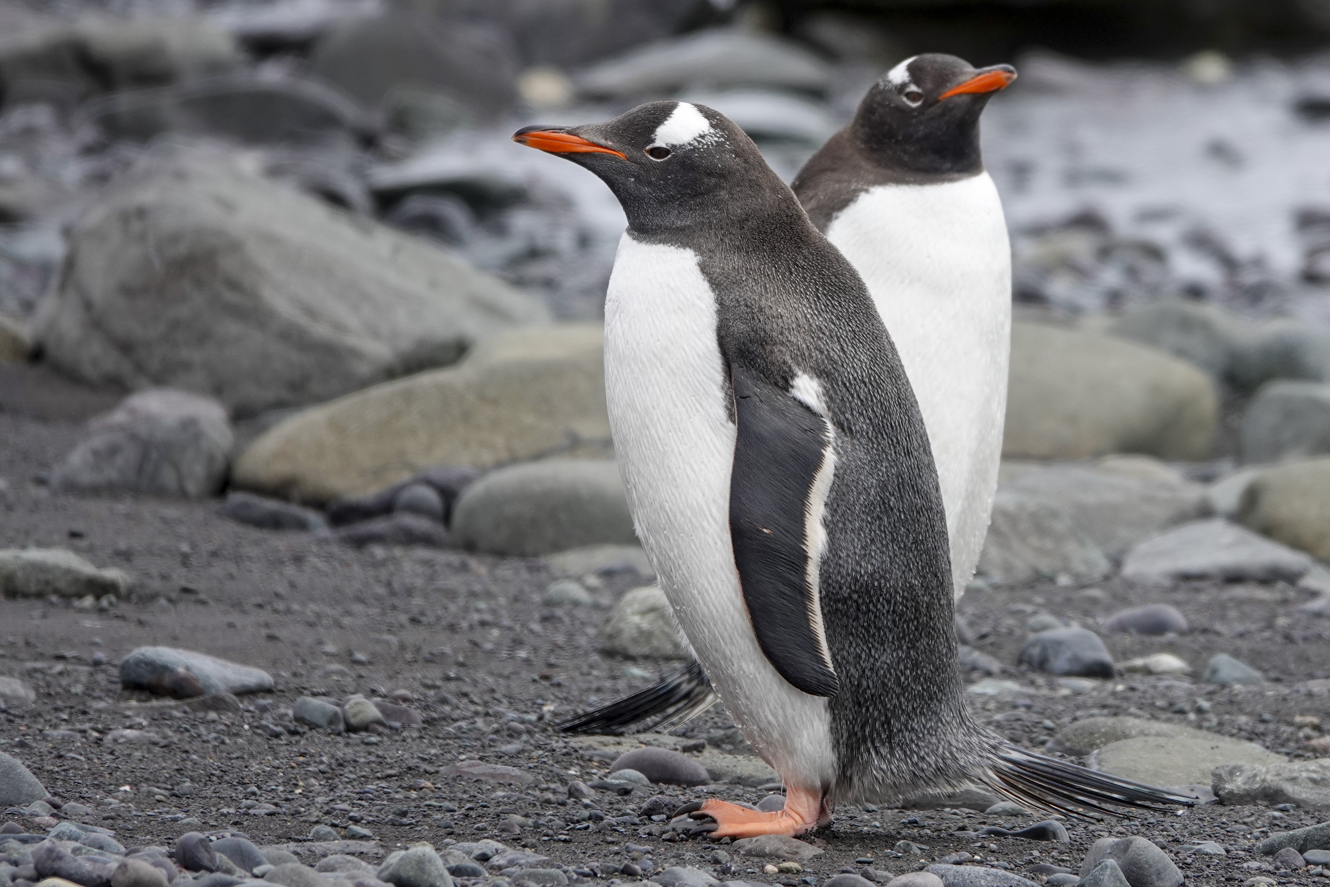 Ensuite, nous passons par le centre de plongée en tentant d’éviter les deux éléphants de mer qui nous barrent le passage. Derrière ces deux colosses, un petit attroupement de manchots papous se jette à l’eau si l’on s’approche trop d’eux.